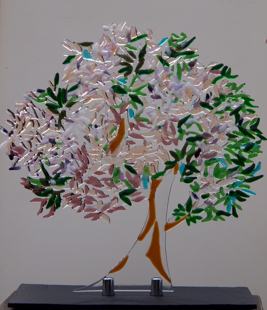 " VOLOP LENTE " Een nieuw glasobject naar eigen ontwerp. Honderden blaadjes heb ik hiervoor gesneden voor deze boom vol bloesem. De boom is gefusd op bijna 800 gr. Hij staat op natuurlei. Familieboom