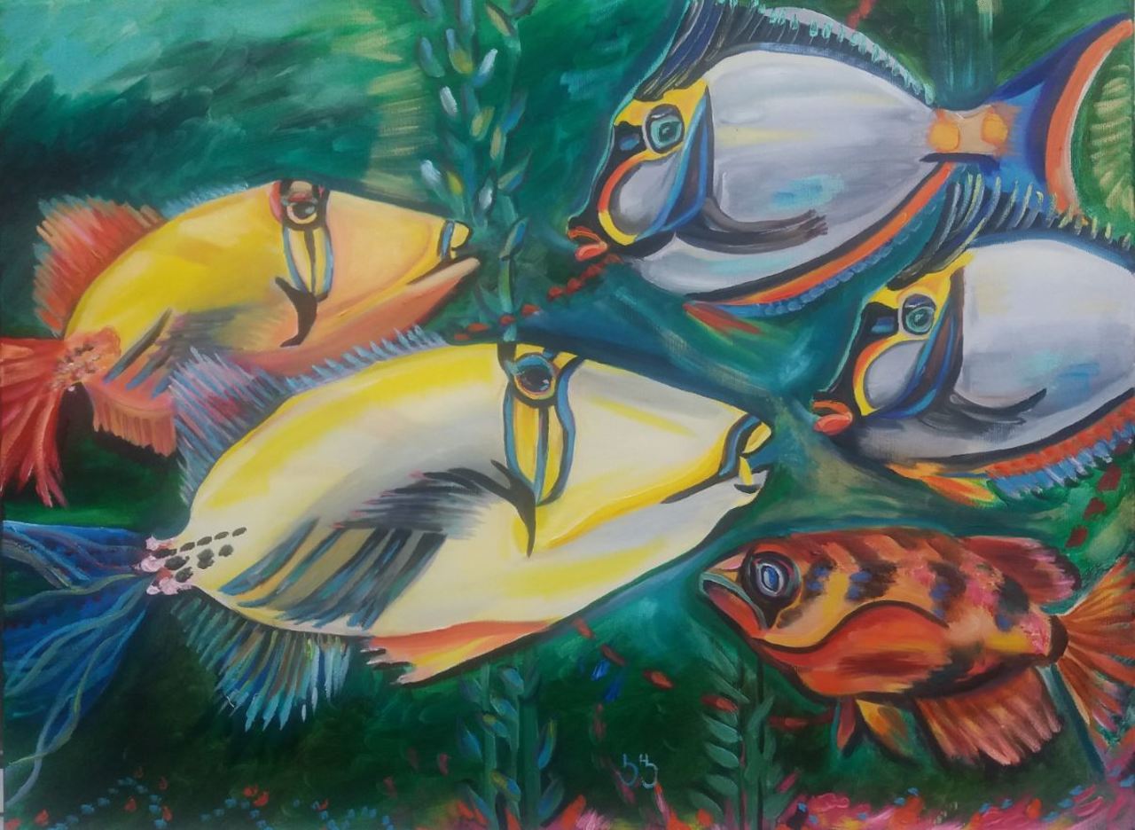 Surreel Abstract Yellow Green Vissen Pink Orange Zwemmen Fish Swimming Picasso