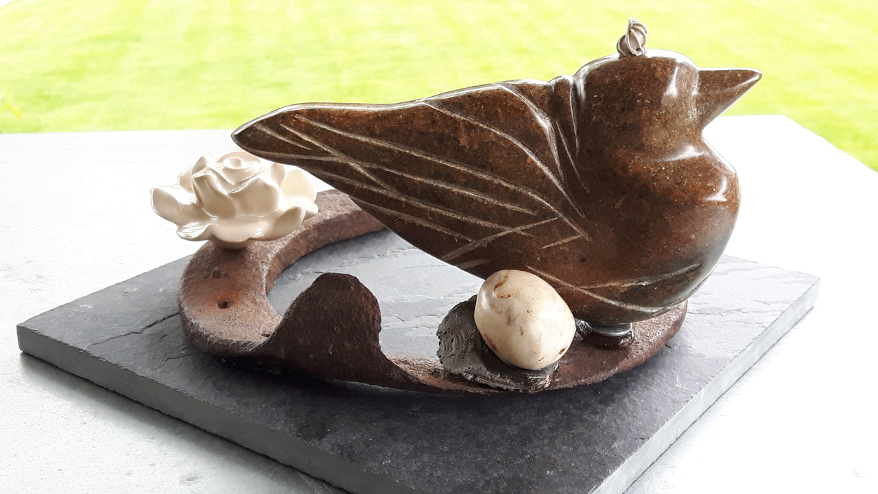 Spekstenen vogeltje op een oud hoefijzer.