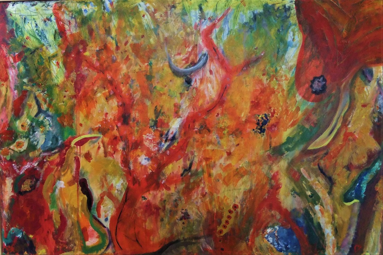 Het begon met een bloeiende boom, maar langzaam liep de hele zomer vol. Ver op de achtergrond zijn nog de takken van een bloeiende kersenboom te zien. Al doende groeide er van alles, zoals altijd in lente en zomer, door groeilust en hevigheid op zoek naar plekje op deze aarde en in dit schilderij. Het is veel en druk, kenmerkend voor mijn beginperiode in het schilderen.