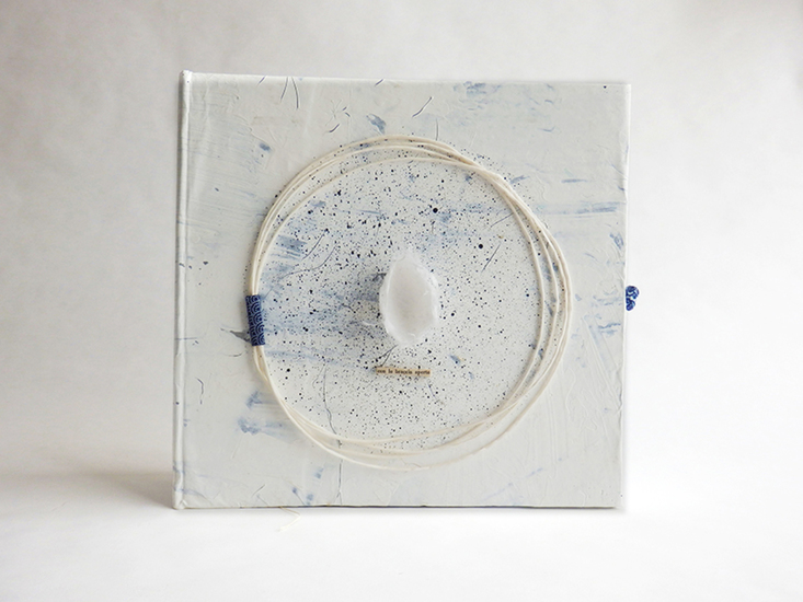 Herinneringsboek Le surf côte mes lèvres heeft een minimalistisch, bewerkt omslag met een wit geschilderde ondergrond waardoor grijs zwemen en kleine krasjes te zien zijn. Gecentreerd zie je een half ei gemaakt van Japans papier met daaronder een reepje tekst uit een oude Franse roman. Eromheen zijn een cirkels van gedraaid zijdevloei die samengehouden worden met een reepje blauw, gedessineerd papier. De klep van het omslag wordt met een touwtje vastgezet aan een Delfsblauwe kraal. Het boek wat in de doos ligt heeft 140 pagina's, alle bladzijdes zijn te beschrijven. Het is jammer dat er maar 1 foto te zien is want de doos heeft een hele sfeervolle binnenbekleding en er ligt een uniek, handgemaakt boek in waarvan de pagina's op een speciale manier bewerkt zijn. Als je geïnteresseerd bent, laat een berichtje achter en ik stuur je meer beeldmateriaal toe van dit boek!