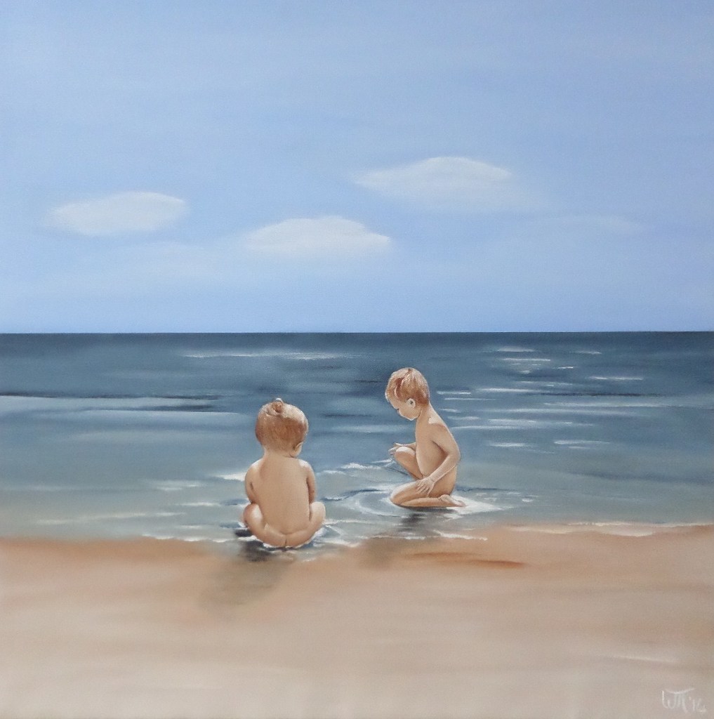 45 Srandtafereeltje van twee broertjes spelend in de zee. In opdracht geschilderd aan de hand van een foto.