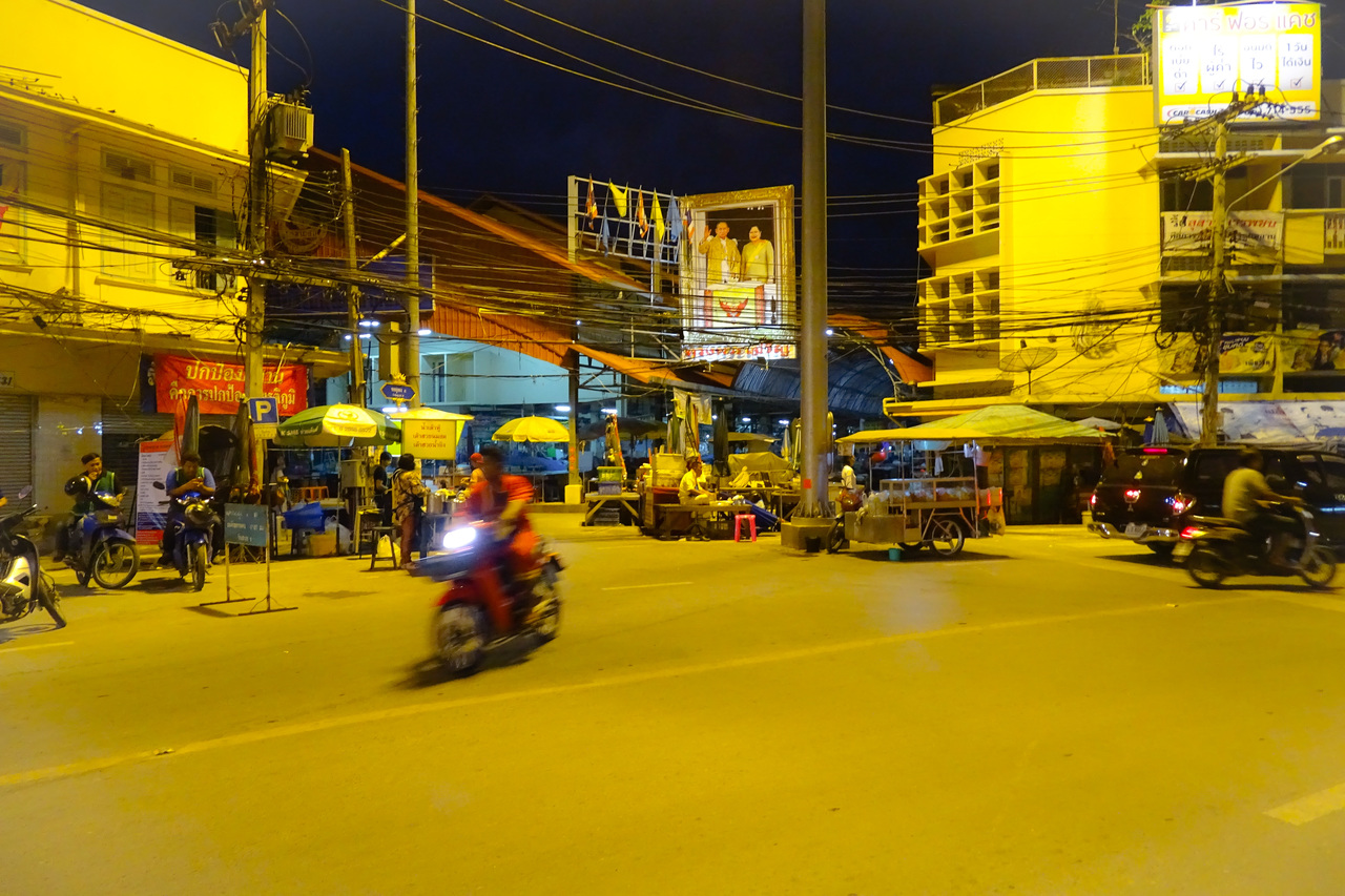 Een straathoek in Ayutthaya, Thailand rond middernacht.