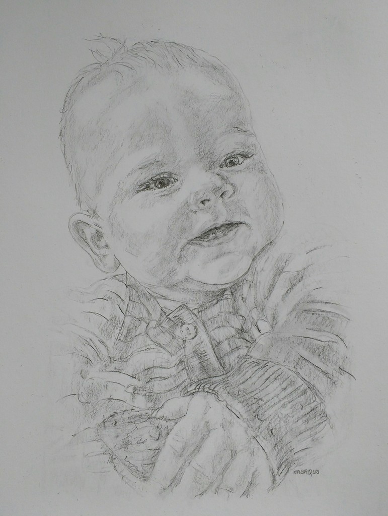 Portret tekening baby in opdracht, Getekend met grafietpotlood op papierformaat 50x65 cm.