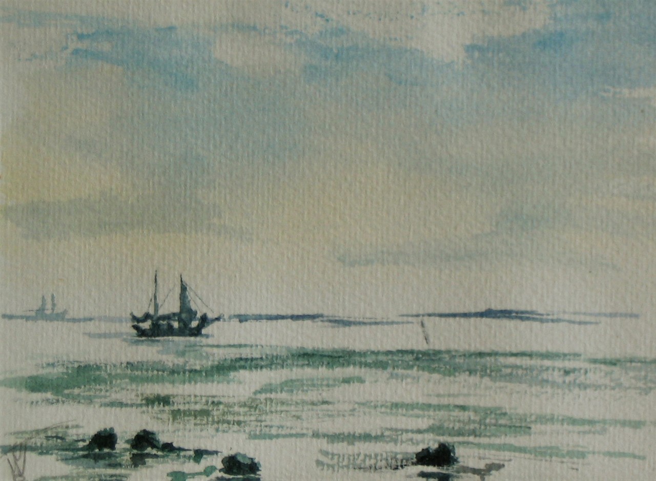 Afgemeerde boot met gereefde zeilen op het wad van Vlieland, verkocht Ingelijst in passe-partout 25 x 25