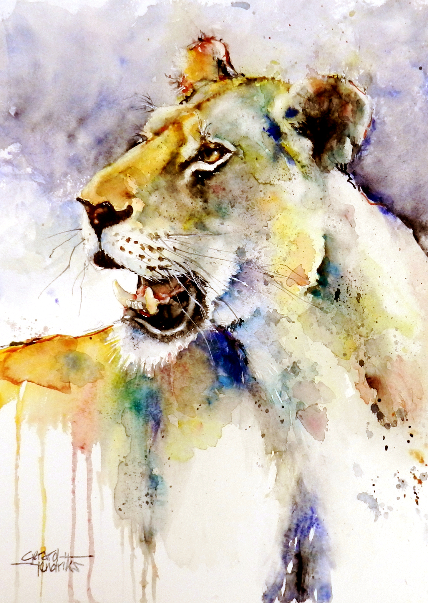 6905 Een leeuwin straalt kracht en gratie uit, een perfecte inspiratie om te aquarelleren, met een spel van licht, schaduw en kleuraccenten probeer ik haar karakter tot leven te brengen.