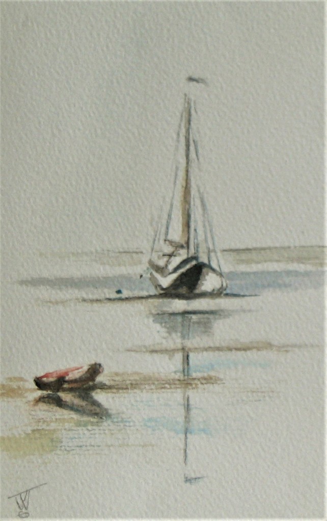 Afgemeerde zeilboot met roeibootje op het wad van Vlieland, verkocht. Ingelijst met passe-partout 25 x 25