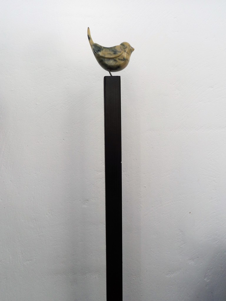 lief vogeltje van speksteen op een hoge zwarthouten paal. verkocht.