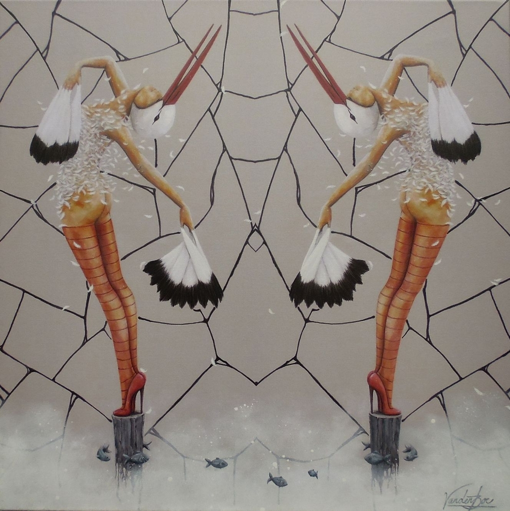 Sold Twinned is een schilderij van twee gespiegelde vogelvrouwen (ooievaars) op canvas.