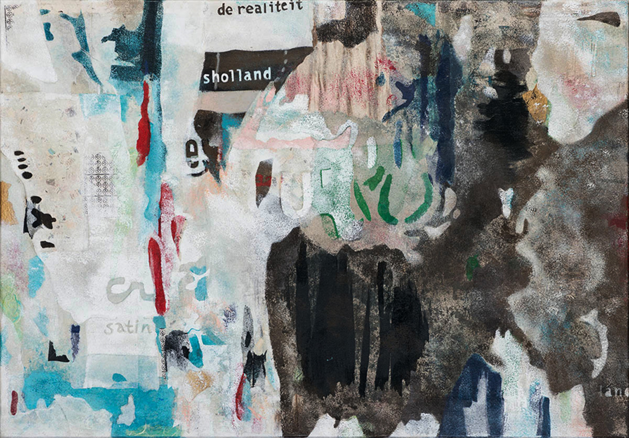 Inspiratie: verweerde muren, (afgetrokken) affiches. Het schilderij is in lagen opgebouwd met verschillende materialen en technieken.