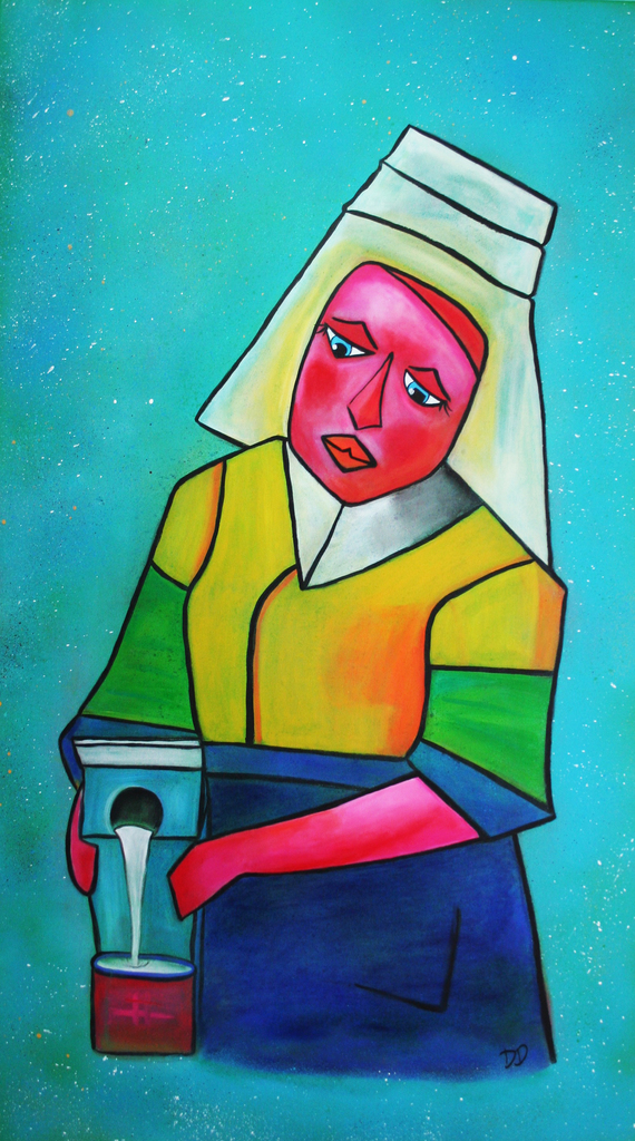 Het traditionele melkmeisje met haar melkkan wordt hier vervangen door een modern pak melk, een knipoog naar de veranderende tijden en technologieën.