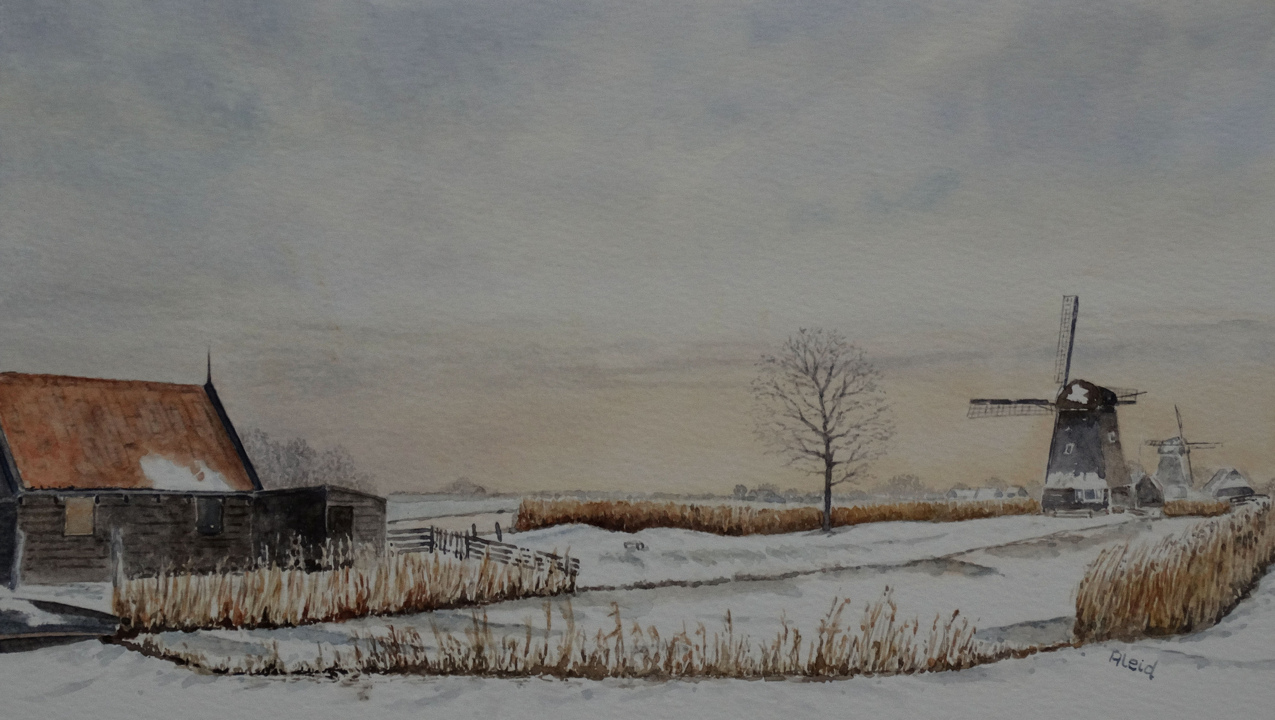 Aquarel Sneeuw Molen Rustenburg Noord Holland Winter