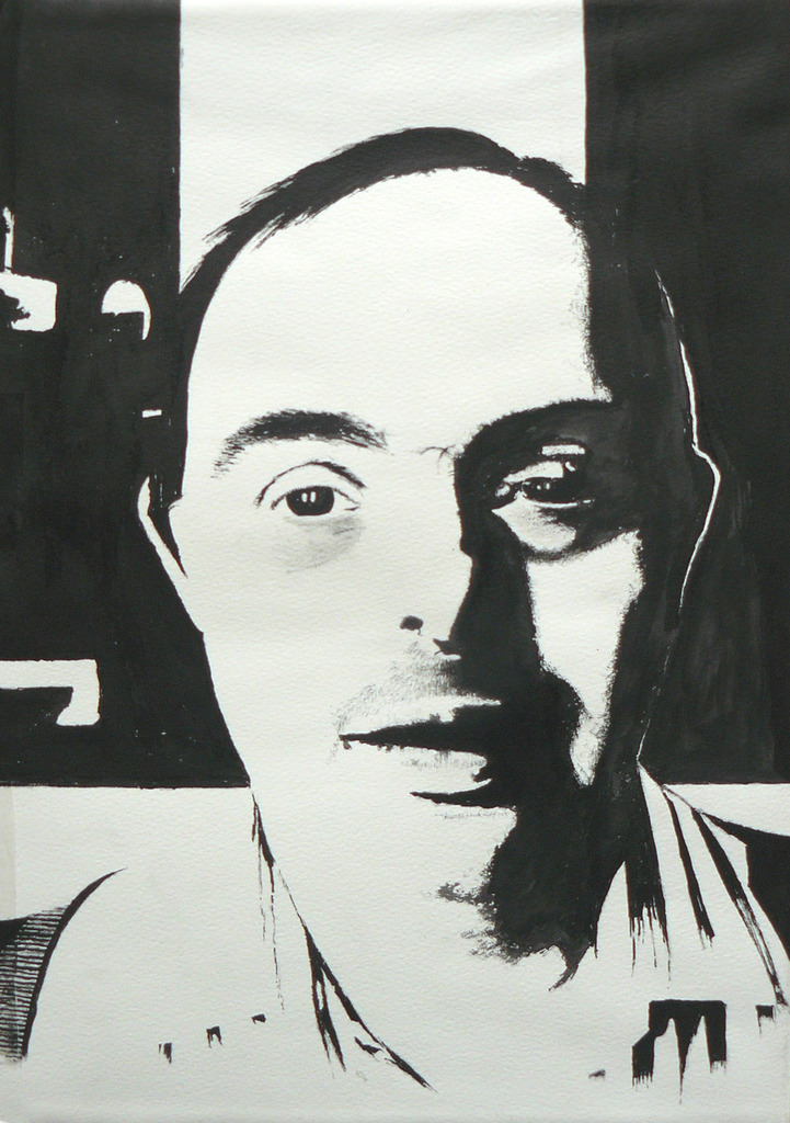 Gezicht van een man met schaduwwerking geportretteerd. In inkt.