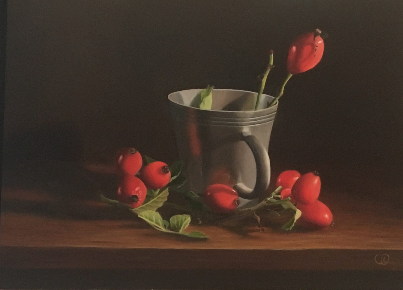 Rozenbottels hebben zulke mooie rood en oranjetinten. Dat daagde me uit om ze te schilderen.