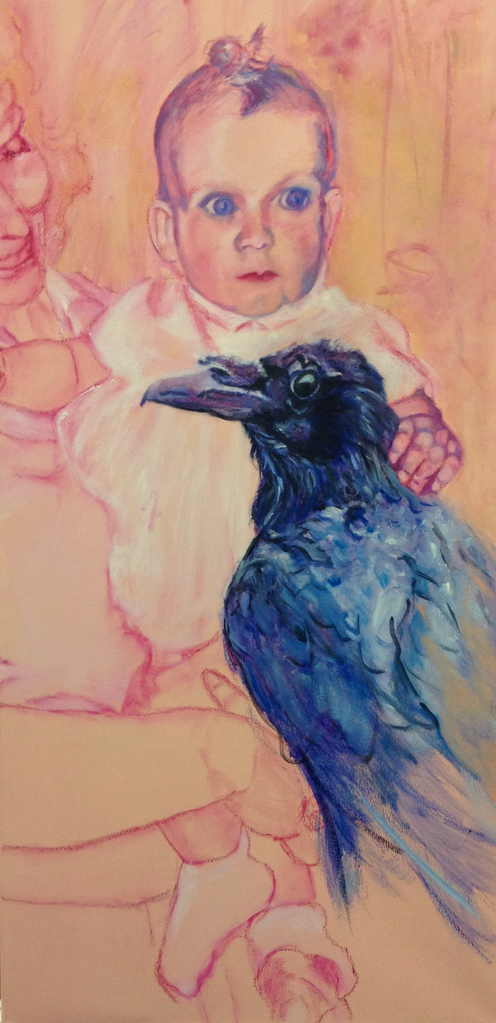 Zelfportret met moeder en kraai. Goddelijke Boodschapper van Zon en Licht, Dood en Duisternis Boodschapper, orakelspreker andere werelden Sennelier oliepastels en olieverf op doek