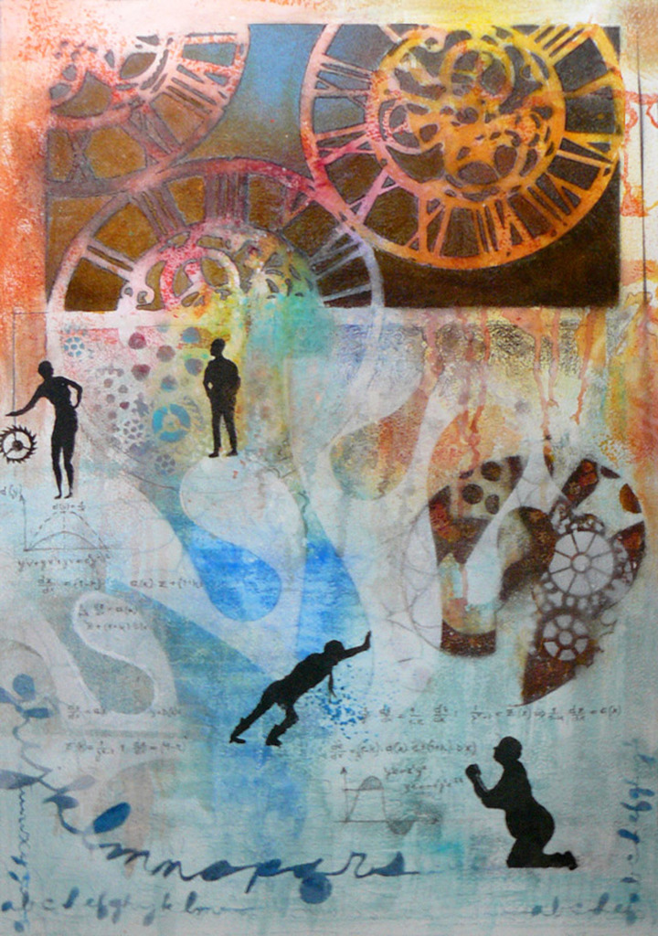 Techniek neemt het steeds meer over van de mensen. Sommigen zijn er slachtoffer van, anderen maken er gebruik van. Gemaakt in acryl. Gebruik gemaakt van zelfgemaakte sjablonen.