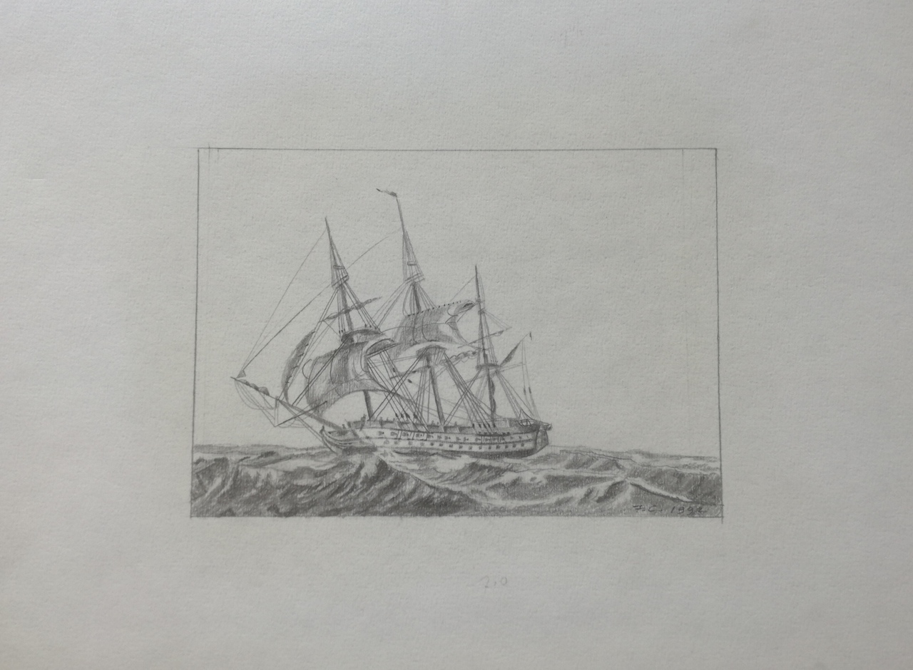 Wit Zwart Potlood Oorlog Zeilen Driemaster Linieschip Lenzend Boot Schip Vaartuig