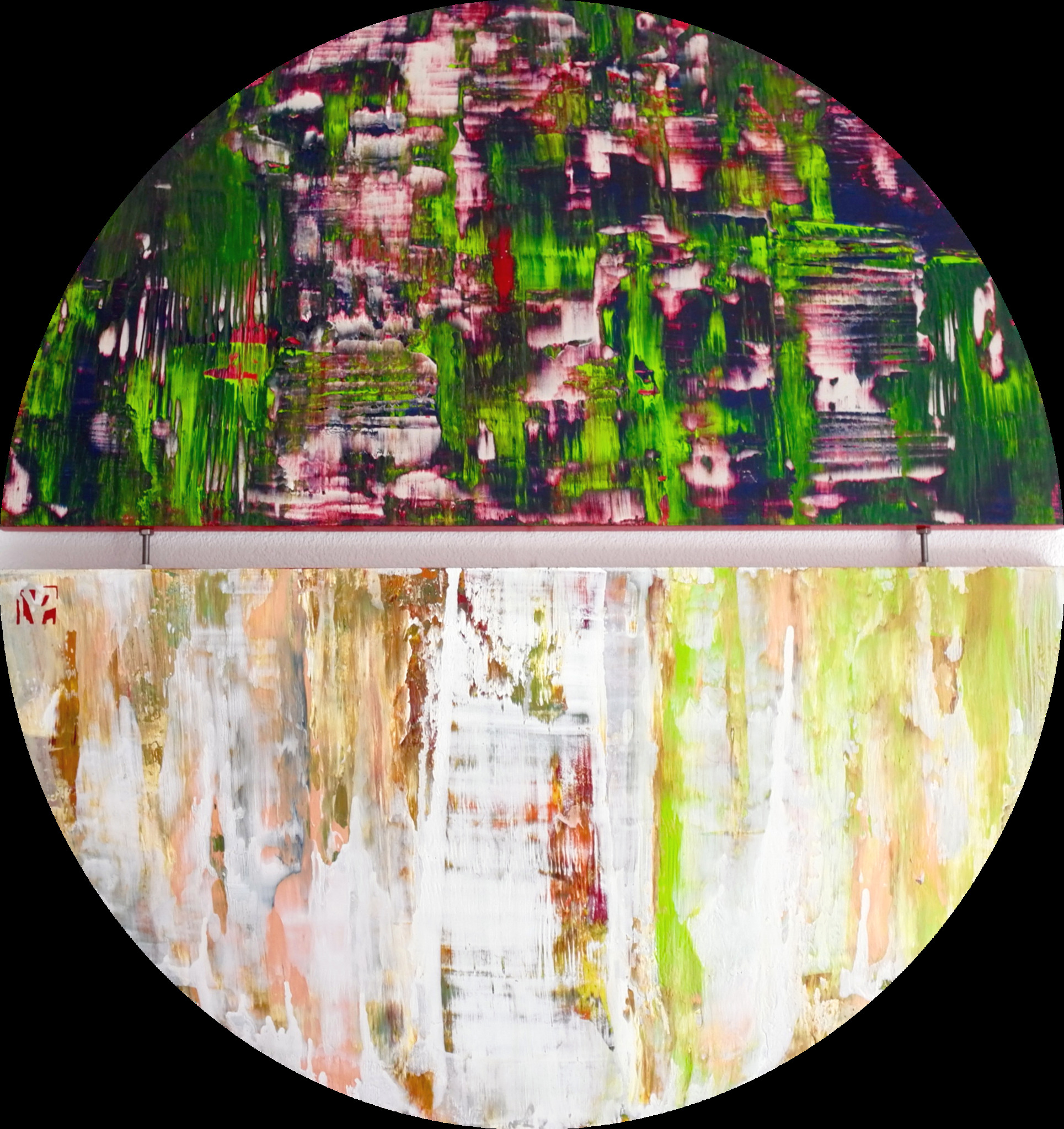 Not a standard shaped painting. Diptych. Two Half round shaped wooden panels, joined with bolts to create a industrial look.The two parts are a contrast of bright colours and an illusion of a luminous glow. A heavily textured upper panel and a light milky lower panel.The painting is inspired by light. Bright sunny days and nights with a luminescent bright full moon that inspire extraordinary bright, playful colour combinations.
