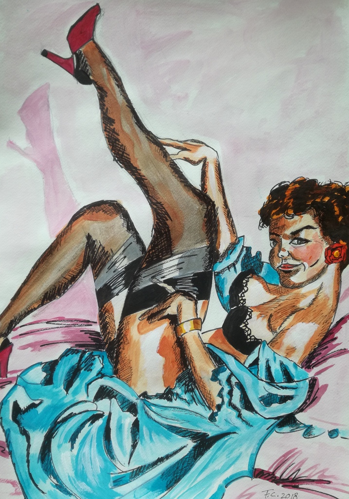 Ingekleurde schets/studie met acryl en stift naar een werk van G. Elvgren.