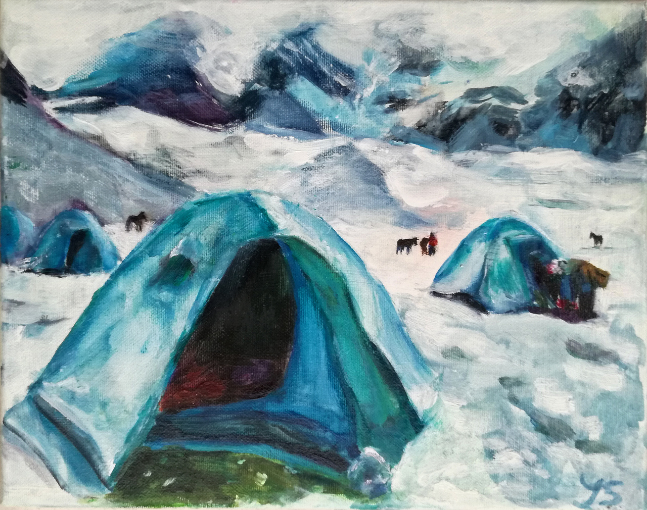 Een ijzig koude ochtend tijdens een wandelreis in Peru. Schilderij voor een vriend.