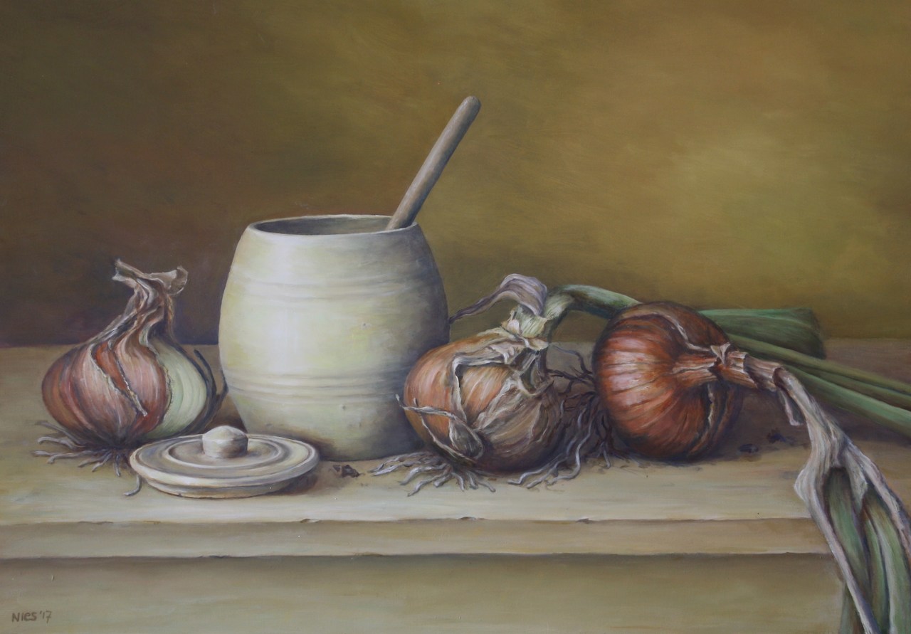 Nies van Dijk schildert met olieverf en eitempera. De dynamiek van vergankelijkheid in de natuur is een terugkerend thema in haar werk.
