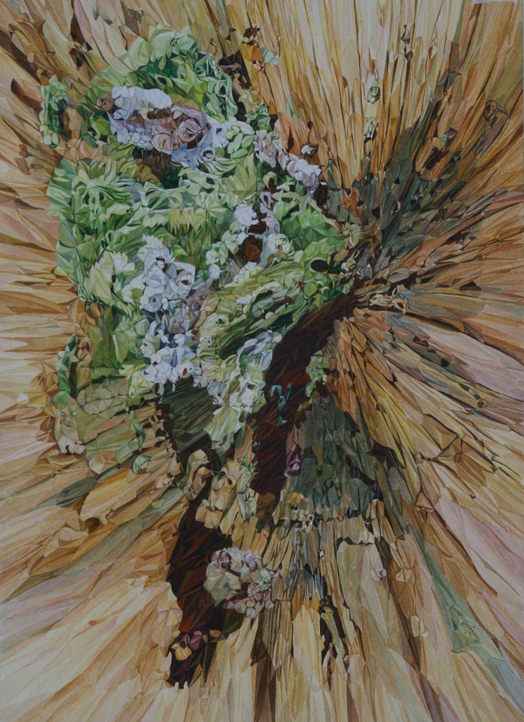 De merkwaardige stijl in een groot deel van haar werken is de sublieme opbouw met allemaal kleine driehoekjes. Niet alleen het geduld maar vooral het eindresultaat is als het ware een visitekaartje voor haar....