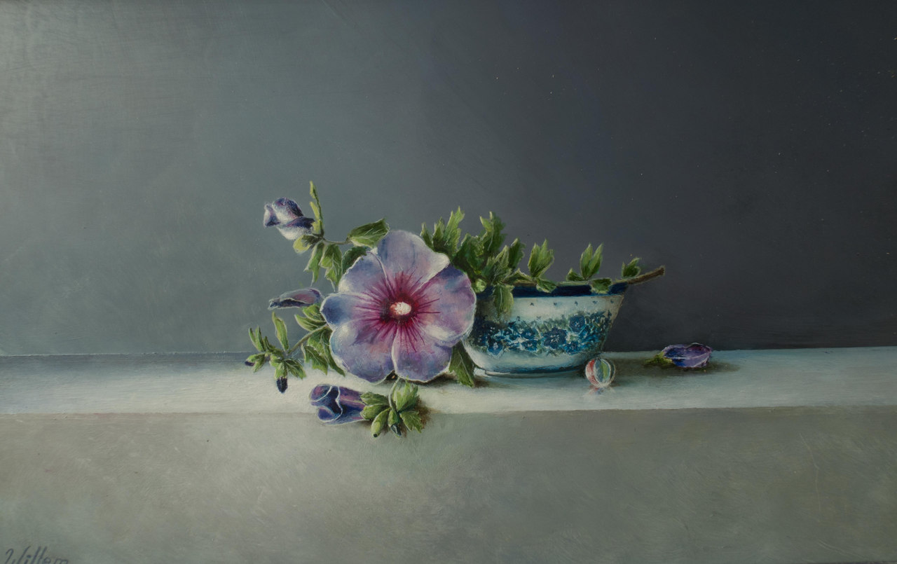 Een stilleven van een schaaltje met een hibiscustakje.