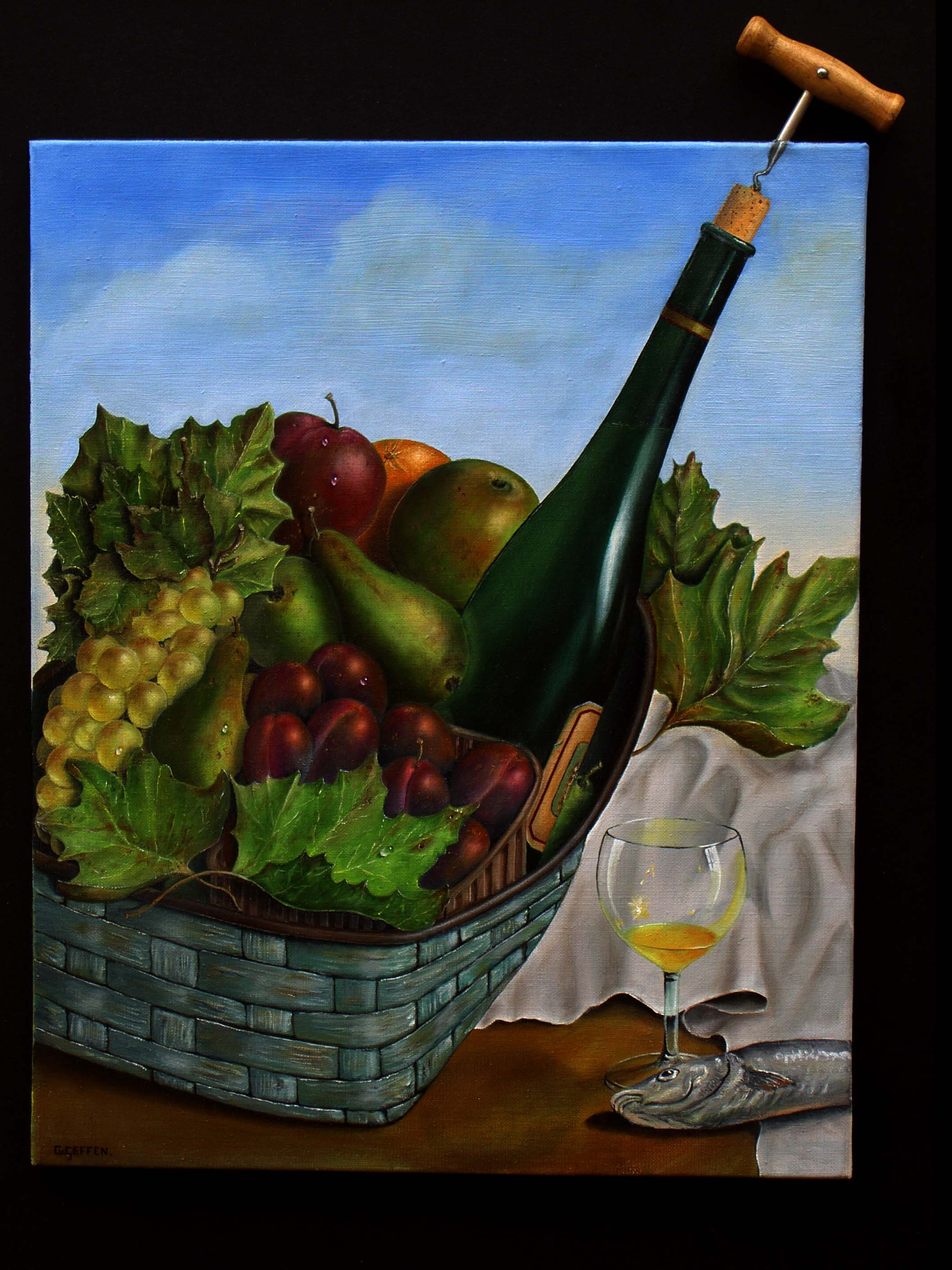 Toegepast Realisme. Realistisch geschilderd.Olieverf op paneel.Kurkentrekker aan kunstwerk gemonteerd.Zie ook detailfoto.