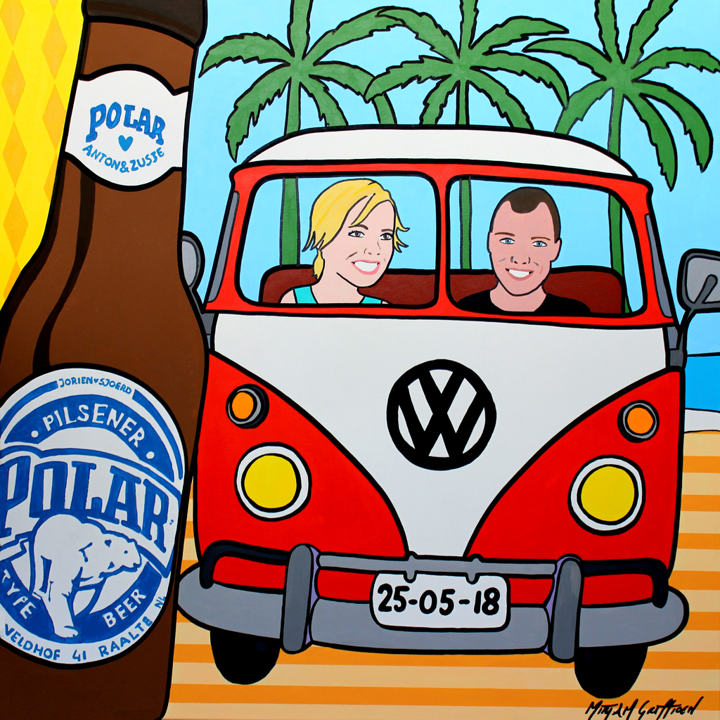 Strand Liefde Bier Palmbomen Vw Busje Trouwerij Kado Gift Curacaokado Polar Camping Beachart Palmtree Islandart Bonaire Curacao Aruba Stmaarten Guadeloupe Happyart Popart Caribbeanartist Caribbeanart Mirjamgriffioen