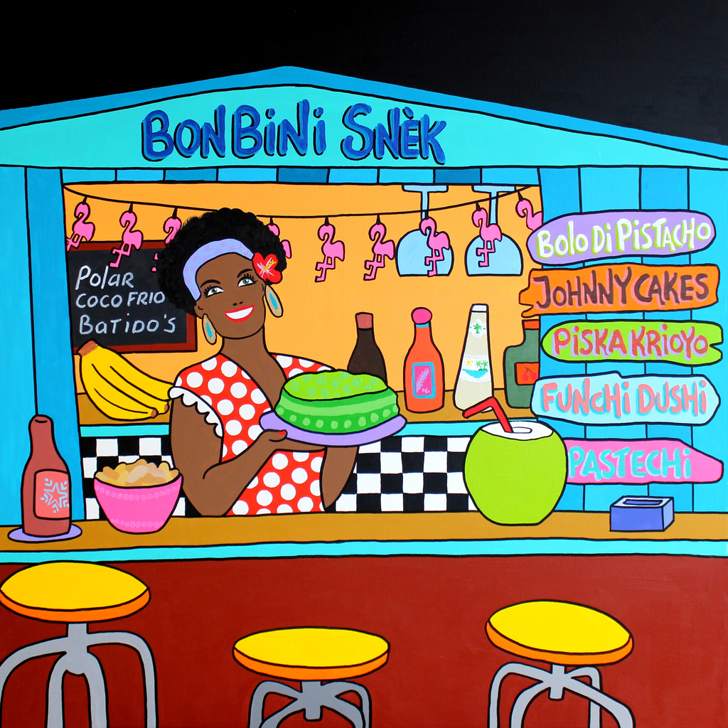 Art Lady Eten Pop Reizen Bar Curacao Antillen Broodje Geschiedenis Caribbean Drijfhout Driftwood Coconut Populair Dushi Bonbini Snek Bolo Caribbeanart Mirjamgriffioenart Mirjamgriffioen Islandart Caribbeanartist Curacaoart