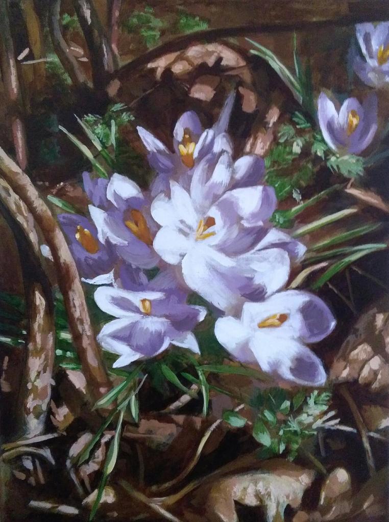 Olieverfschilderij van krokussen in de grond