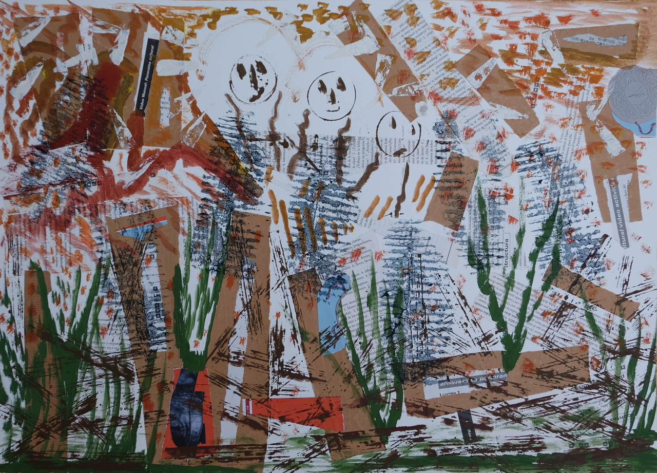 "Vrienden zijn er voor / om te overleven in chaos" (schilderij met adres aan Virgilius, de dichter, en Aeneas en diens vriend Achate). mixed media, collage en verf op papier