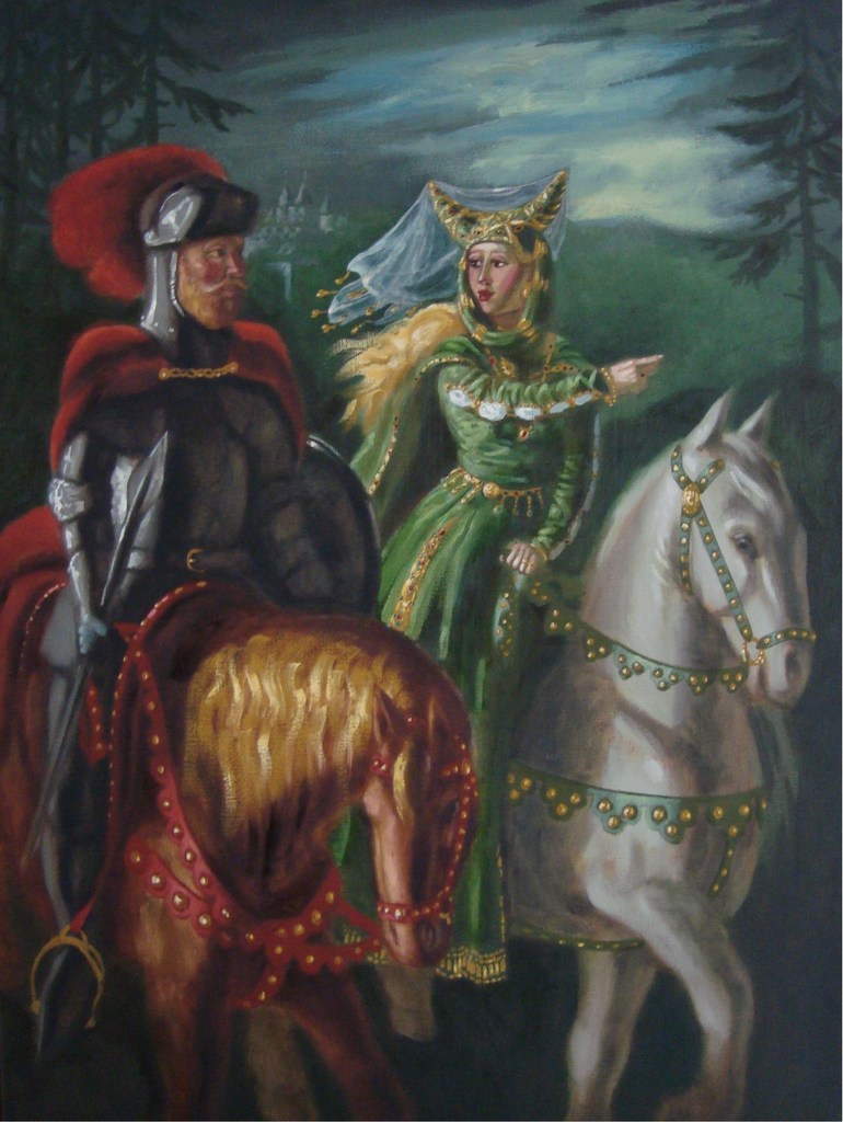 Orgeluse wijst Gawan de weg, uit de Parzival van Wolfram von Eschenbach