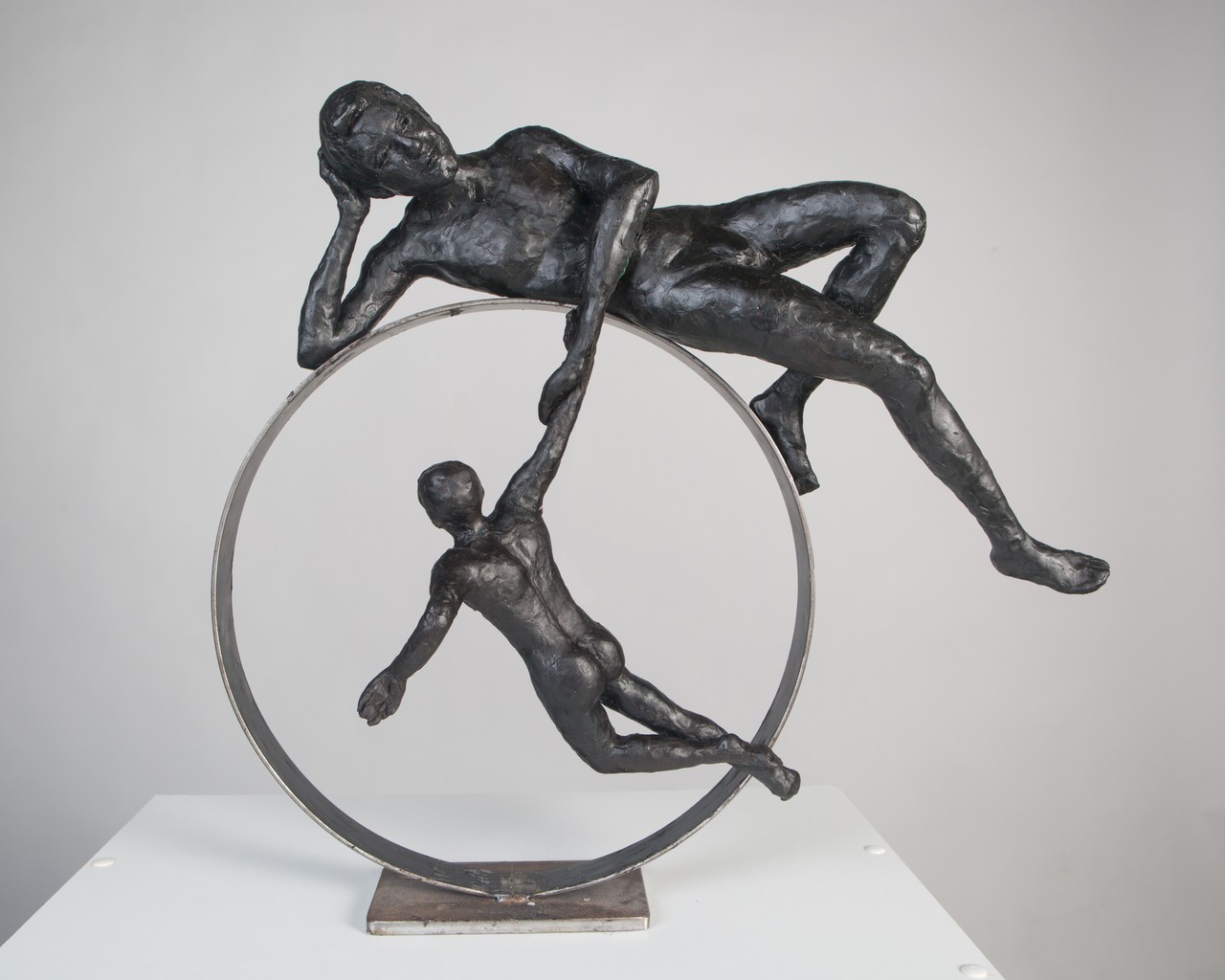 Dit is model in zwarte was voor een bronzen beeld. De grote man ligt op een stalen ring, symbolisch voor een machtig land dat bovenop de wereld ligt, terwijl hij een kleiner mannetje vasthoudt bij de hand. Om te overleven hebben ze elkaar nodig. Voor een goede relatie tussen hen hebben ze elkaar nodig, ze zijn wederzijds afhankelijk van elkaar. Het is bedoeld de samenwerking tussen landen weer te geven op wereldschaal.