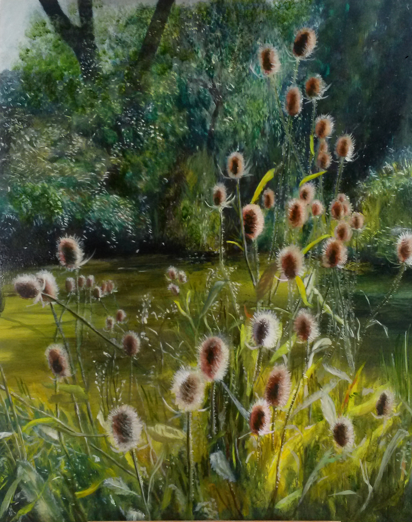 Alsof het water zelf licht geeft. Warm en mysterieus. De kaardebollen hebben een prima plek om te groeien.