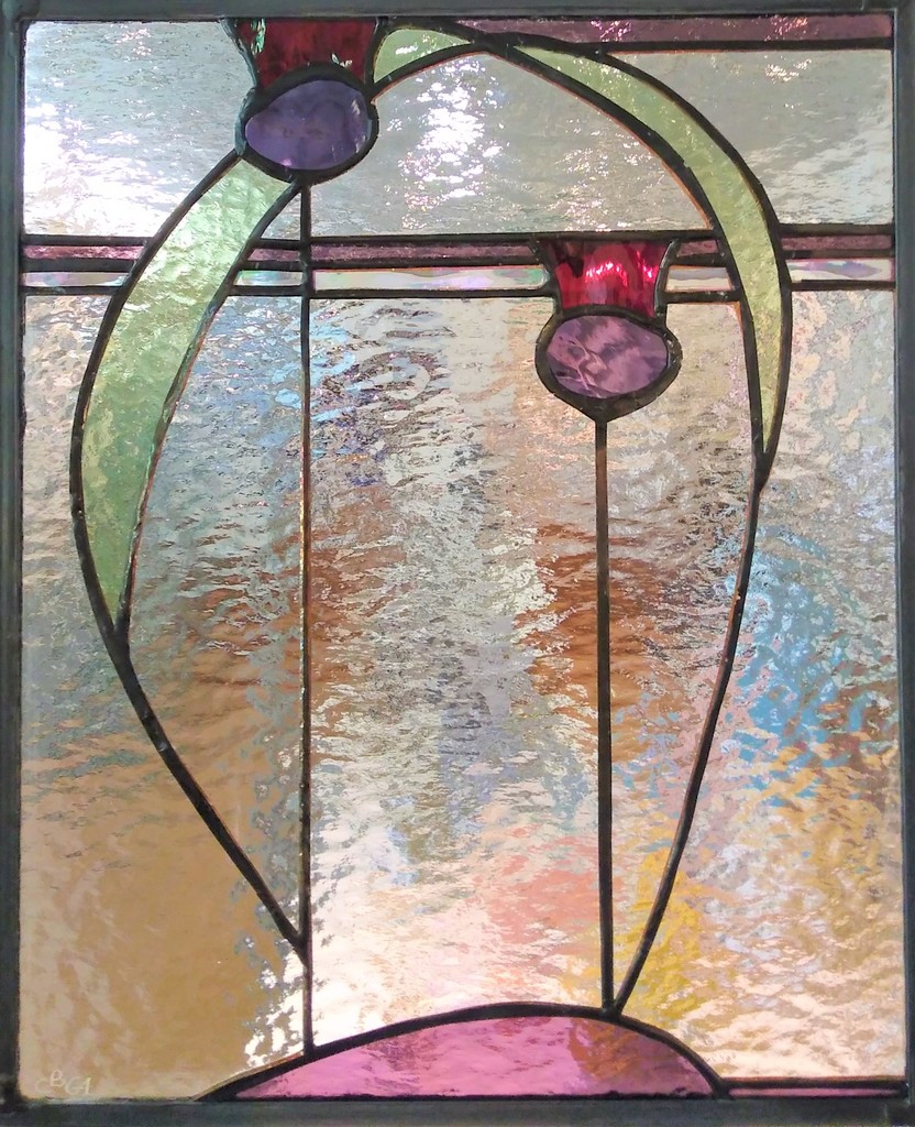 Geïnspireerd op Art Nouveau is dit raam met distels. Zowel kathedraal- als waterglas zijn hierin verwerkt.