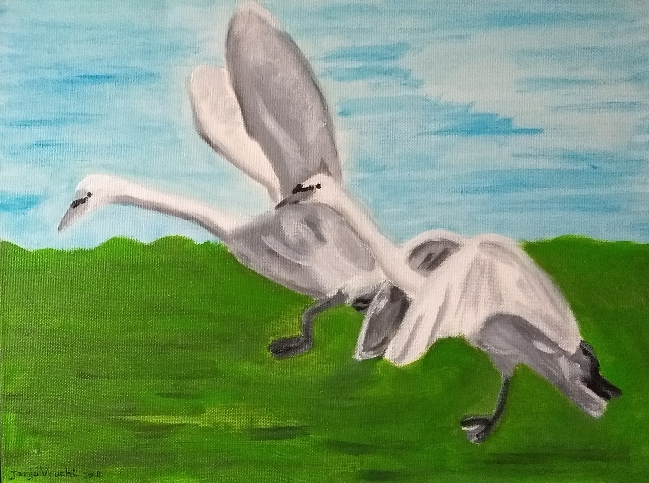 Twee zwanen, naar beelden van Mark De drie, die in mei 2018 tijdens de expositie in de tuin bij kasteel s'Aspremonr-Lynden in Oud Rekem stonden. Ik heb daar op 5 en 6 mei geschilderd in de kasteeltuin tijdens deze expositie.