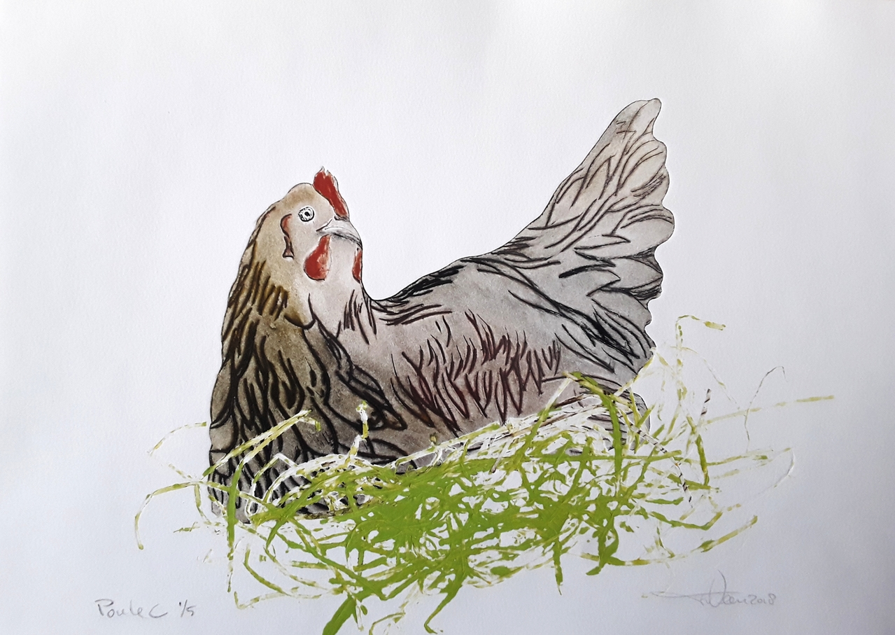 Poule C - Kip C - droge naald en aquatint - uitgezaagde zinkplaatjes - meerkleuren druk - monotype - oplage 1/5