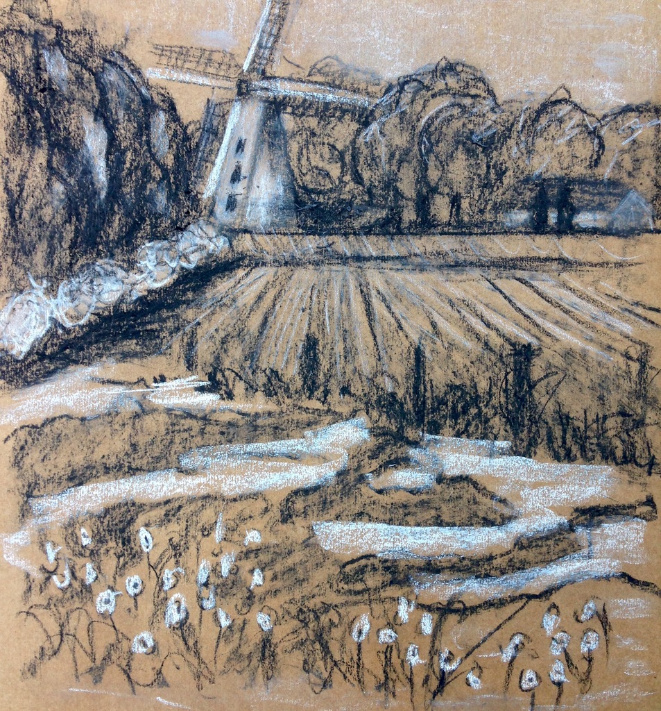 Landschap met molen, syberisch krijt en pastel op bruin papier
