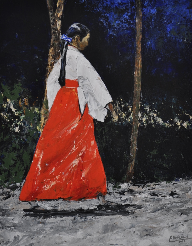 Vrouw werkzaam in de tempel in Japan (onderdeel van een tweeluik) - acryl op doek