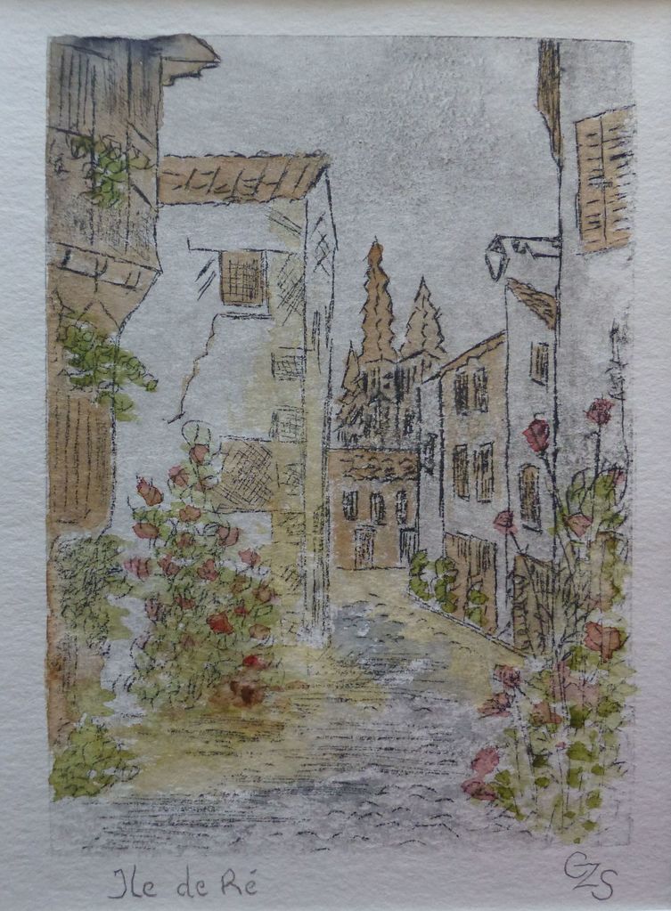 Straatje met stokrozen op het eiland Ile de Ré. Ets met aquarel. In passepartout buitenmaat 24 x 30 cm