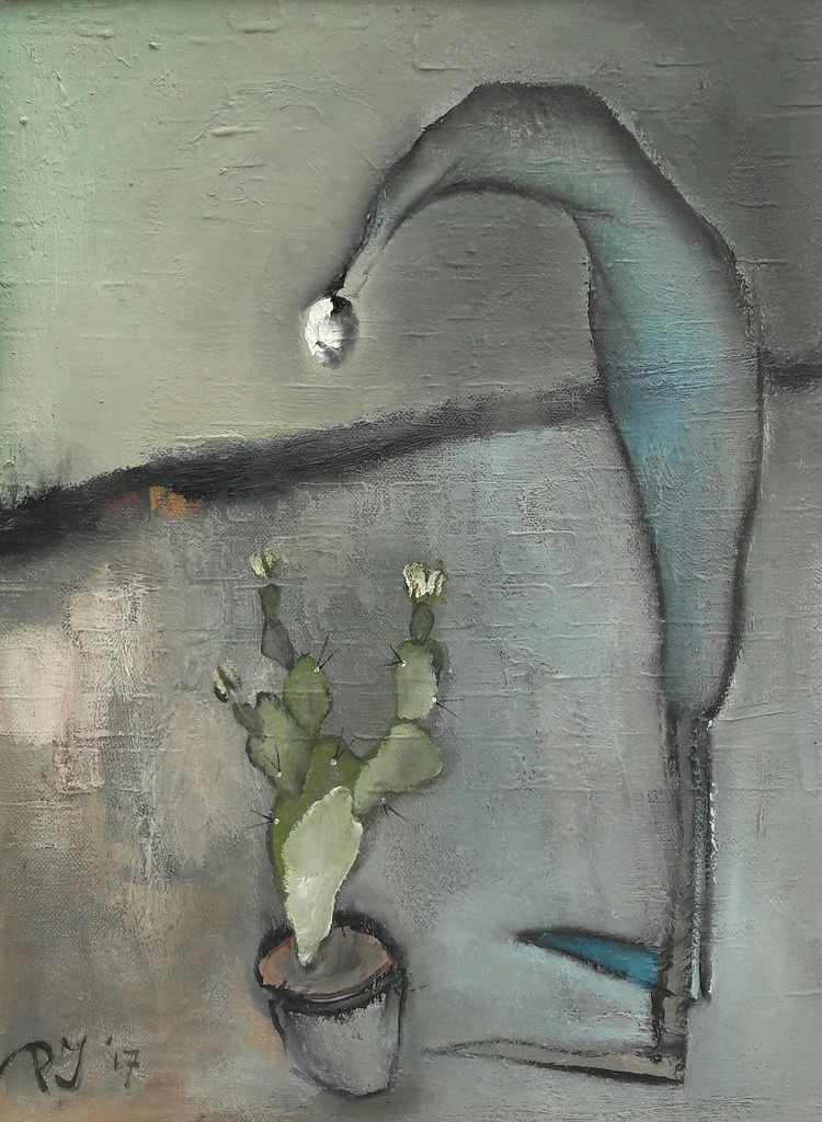 PJ, Alkmaar, 1955(autodidact) Ik noem mij kunstschilder, schrijver en drummer. Aanvankelijk schilderde ik surrealistische stijl. Nam in de jaren 80 deel aan de door actrice Ine Veen en fijnschilder Jean Thomassen georganiseerde kunstmanifestaties door het hele land. Thans sturen mijn penselen mij in de richting van grillige wezens (zgn. 'Grotesken') en schots en scheef bouwwerkjes (zgn. crooked houses).Bij elkaar wat men zou kunnen noemen zelfgeschapen werkelijkheid. Wie weet welke sluimerende penseelstreken eenmaal op dreef, nog voor het ongewisse voetlicht zullen treden. Interpreteren maar. Gaat u gang, kijker.