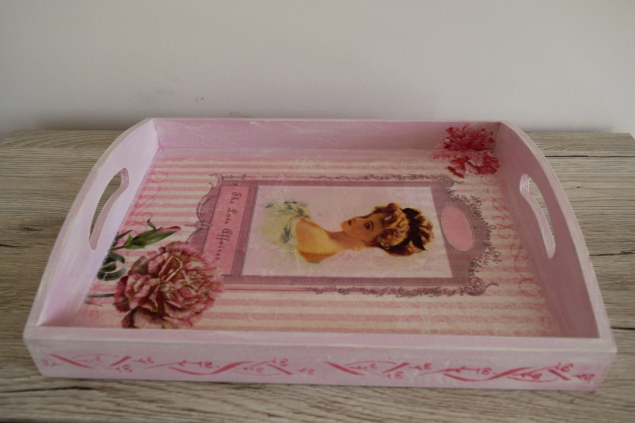 Houten Dienblad Decoupage Handgeschilderd Roos Vrouw Keukenstuk Decoratief Wooden Tray Hand-painted Pink Lady Woman Decorative