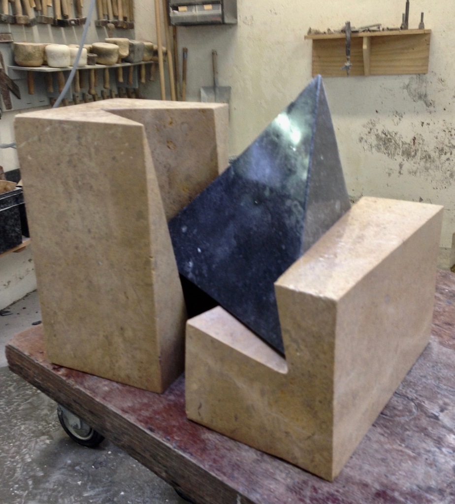installatie uit drie delen. Blgisch hardsteen en Mocca