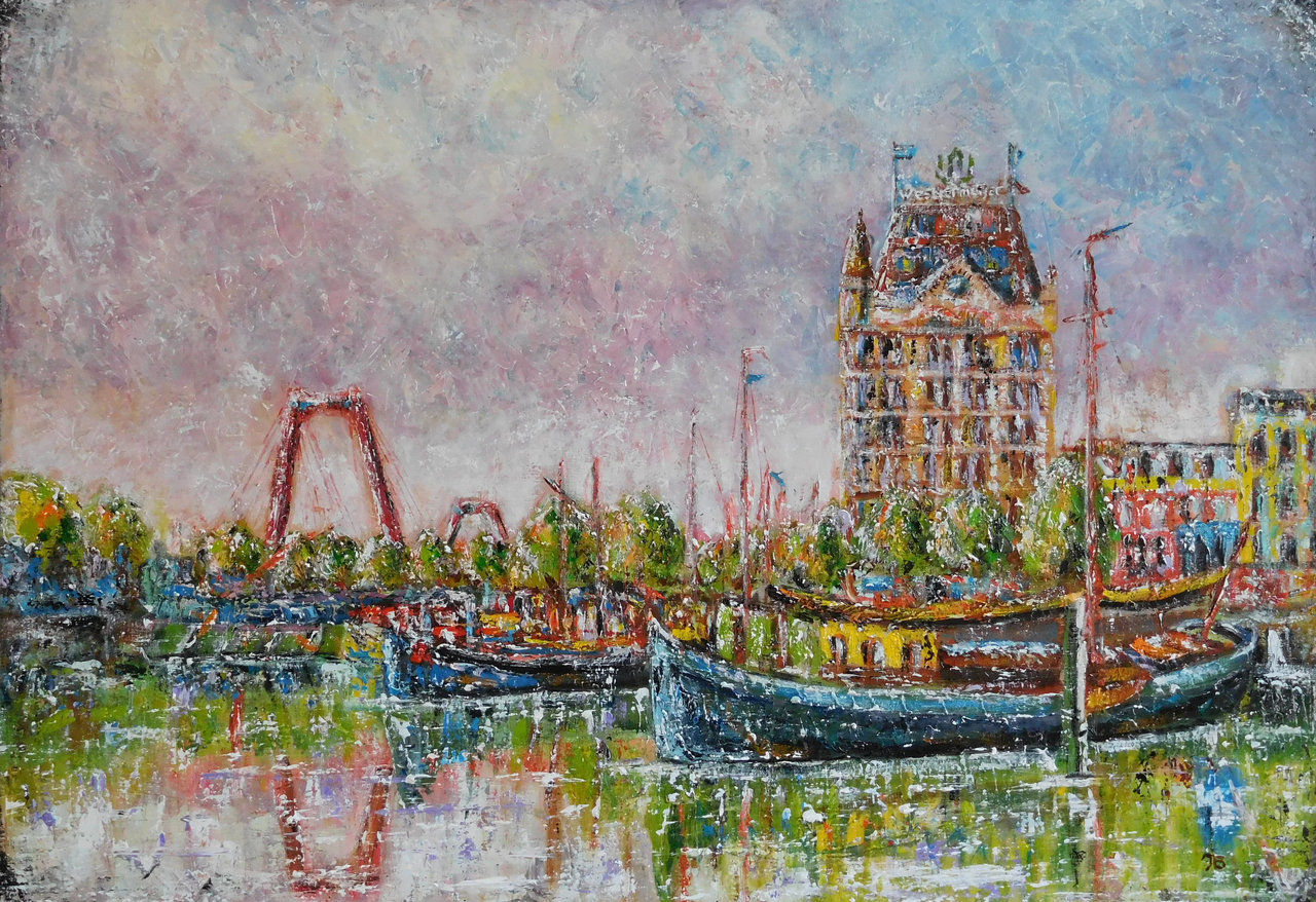 Water Oil Aluminium Olieverf Harbour Haven Paletmes Linnen Boten Schepen Rotterdam Bridge Boats Wittehuis Ships Willemsbrug Whitehouse