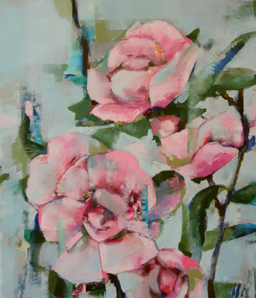 Collage van tijdschriftpapier, beschilderd met acrylverf en acrylpen. Pioenrozen