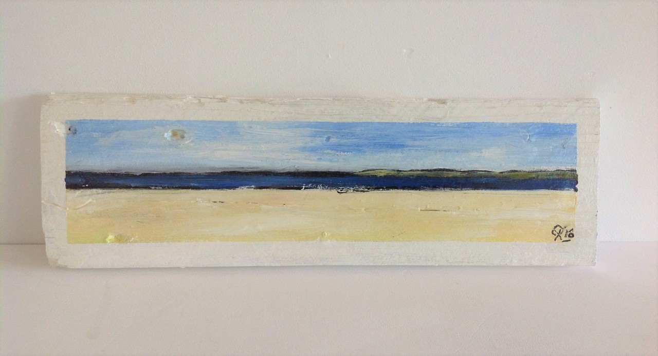 Texelse schildering op hout, met zicht op Vlieland. 15 x 35 x 2 cm.