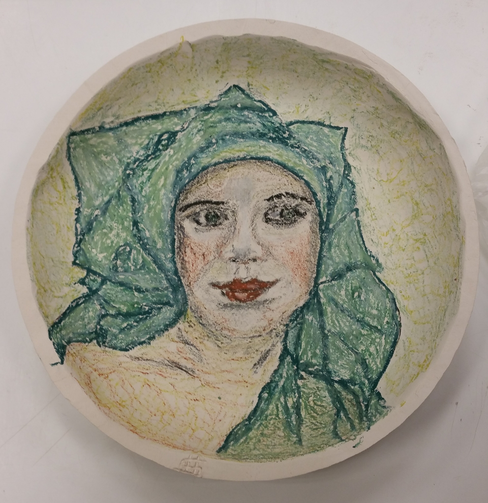 Bord met waskrijt getekend en transparant glazuur.