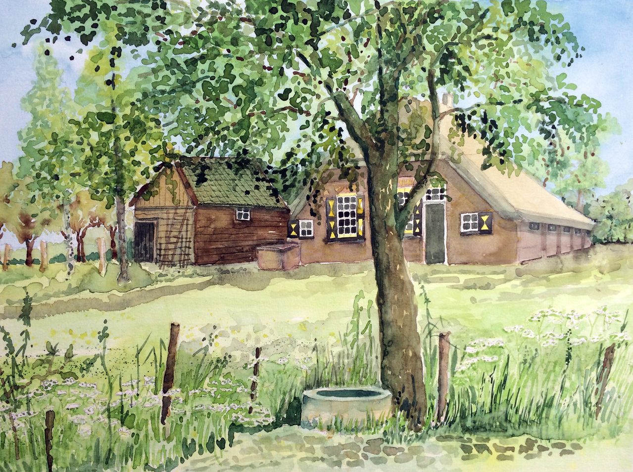 Landschap Aquarel Realistisch Bomen Landscape Boerderij Farm House Schuur Trees Realistic Watercolour Shed Boerenerf Farmhouse