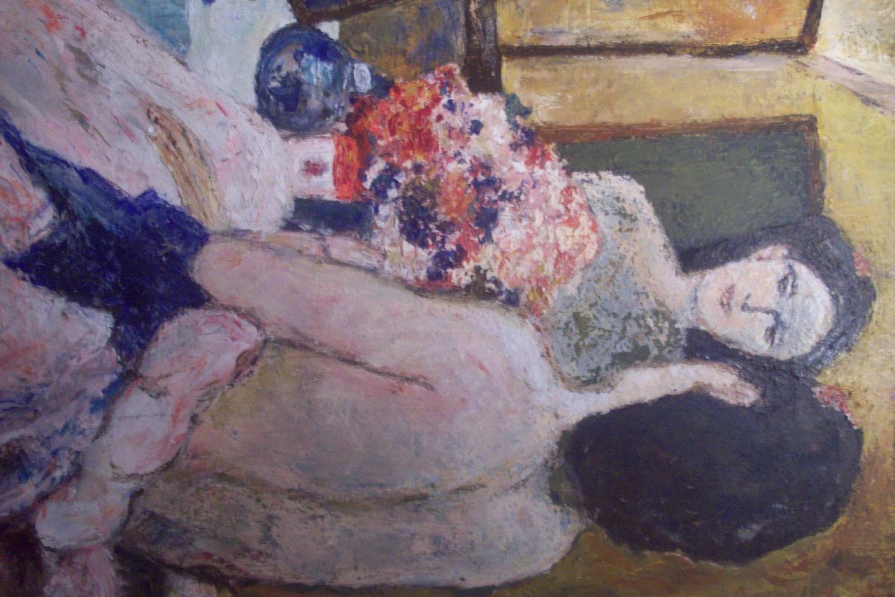 Vrouw , zittend voor de spiegel. Half naakt. Acryl, met palet geschilderd.